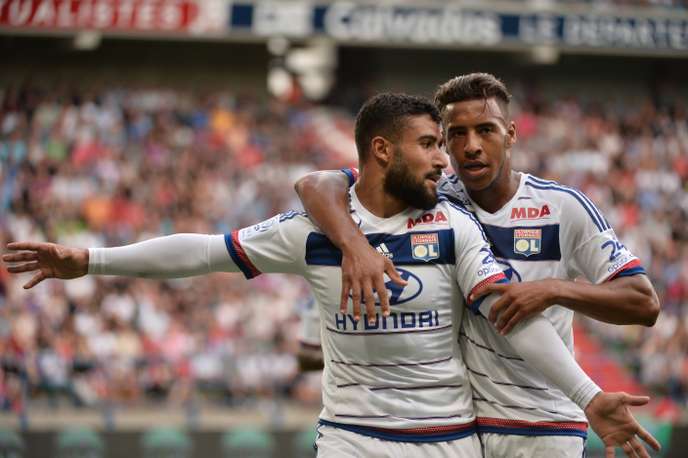 Nabil Fekir qui célèbre un but avec Corentin Tolisso lors du match contre Caen en 2015
